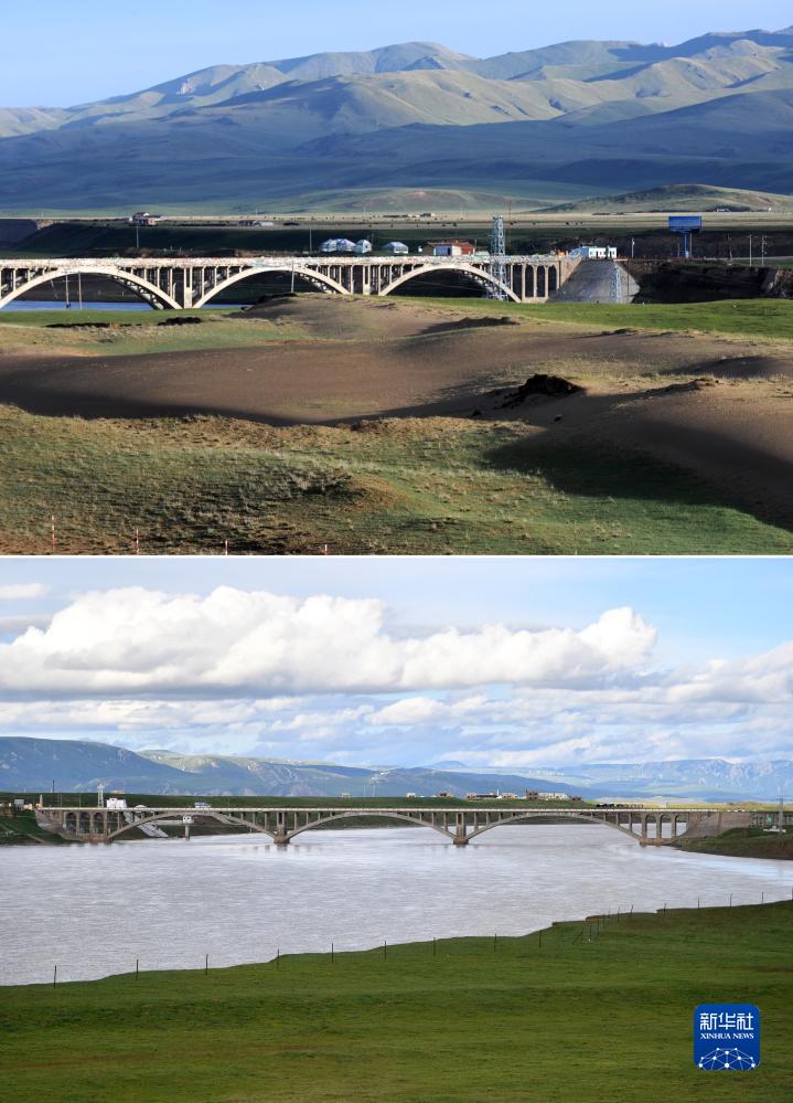 拼版照片:上图为2011年6月10日在甘南藏族自治州玛曲县城郊的黄河大桥附近拍摄的大面积沙化退化草场(新华社记者聂建江摄);下图为2023年7月6日在甘南藏族自治州玛曲县城郊的黄河大桥附近拍摄的沙化退化草场已经复绿(新华社记者陈斌摄)。