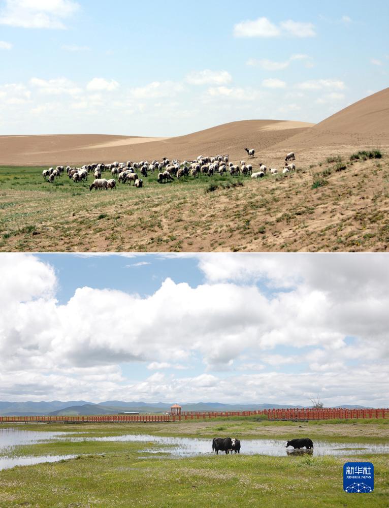 拼版照片:上图为2004年7月19日,羊群在玛曲县一处沙化退化的草场上吃草,背后是大片流动沙丘(新华社记者宋常青摄);下图为2023年7月5日牦牛在玛曲县湿地草原上吃草(无人机照片,新华社记者陈斌摄)。