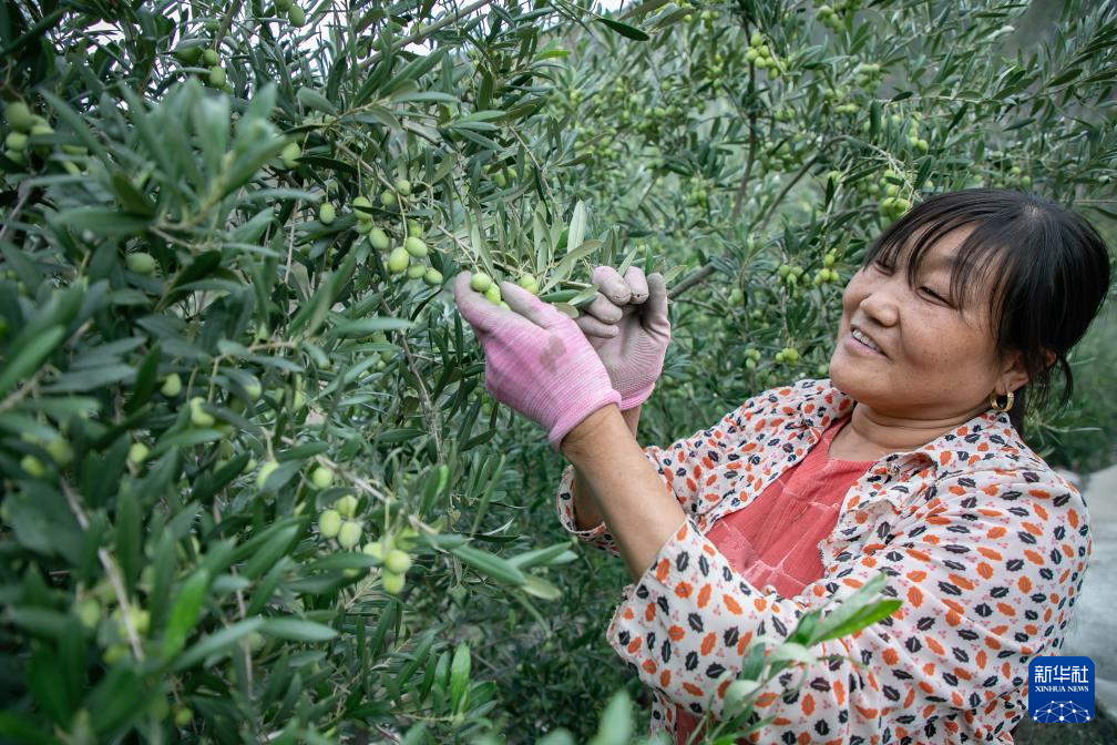 在陇南市武都区外纳镇稻畦村一处油橄榄种植基地,农户采摘油橄榄(10月12日摄)。新华社记者 郎兵兵 摄