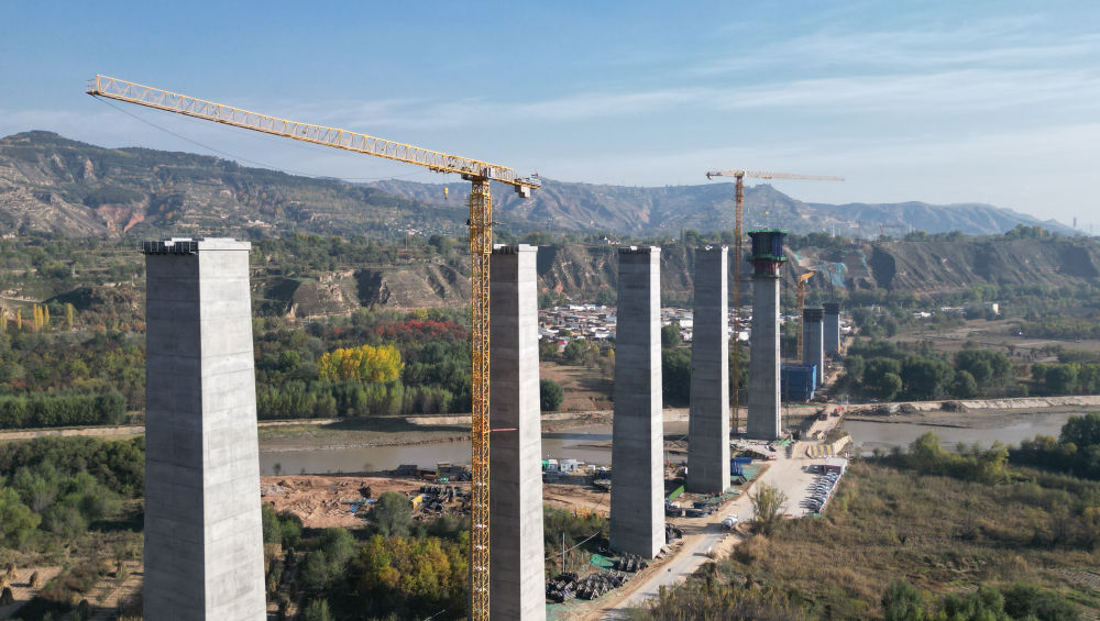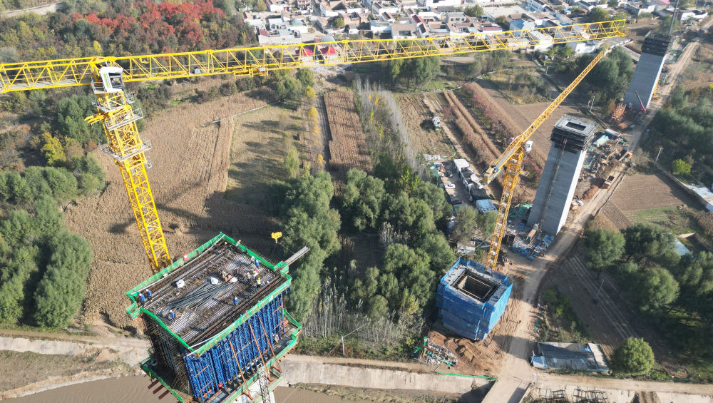 这是10月24日拍摄的位于甘肃临夏境内的兰合铁路4标段北小塬大夏河特大桥墩身施工现场(无人机照片)。新华社发(史有东摄)