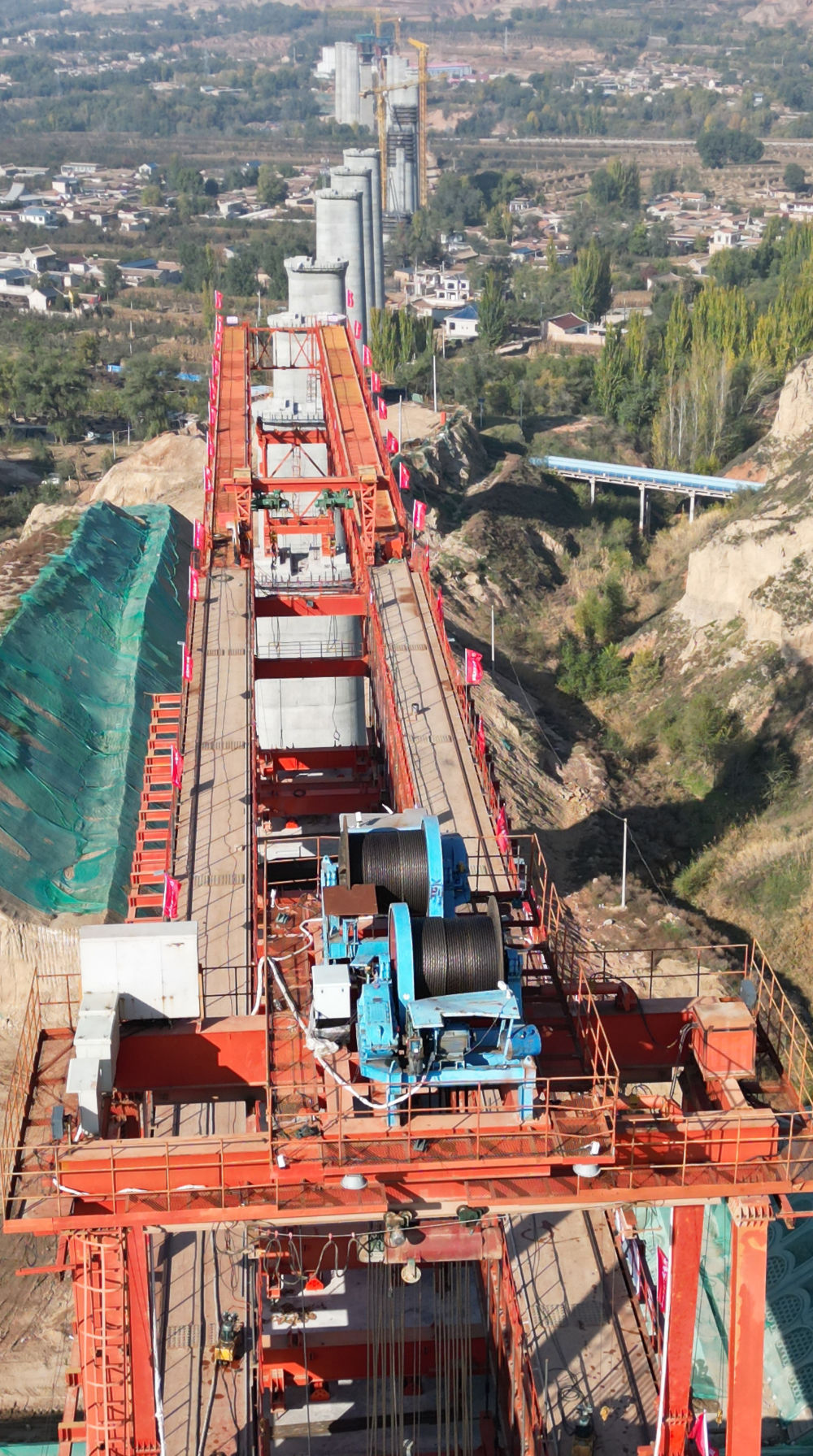 10月24日拍摄的位于甘肃临夏境内的兰合铁路4标段泄湖峡大夏河特大桥胶拼梁架设施工现场(无人机照片)。新华社发(史有东摄)