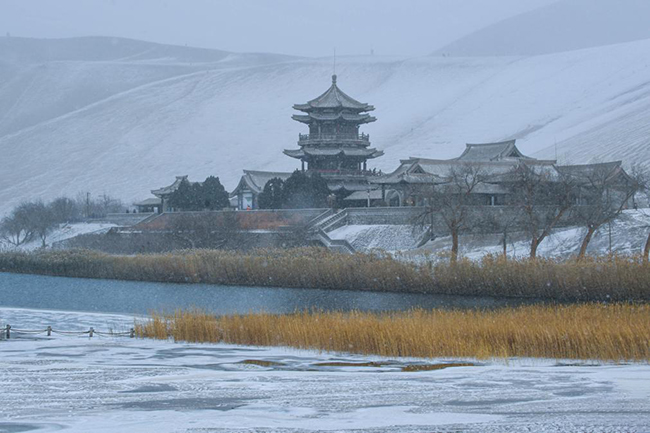 这是甘肃省敦煌市鸣沙山月牙泉景区雪景(12月14日摄)。