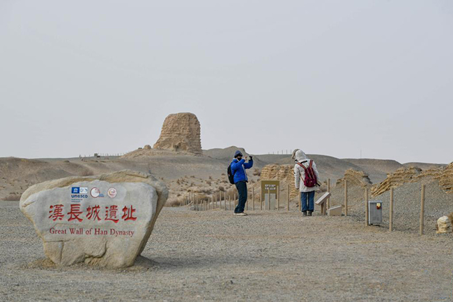 游客在甘肃省敦煌市汉长城遗址游览(12月13日摄)。