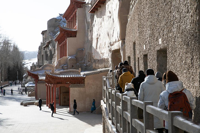 游客在甘肃省敦煌市的世界文化遗产莫高窟参观(12月15日摄)。