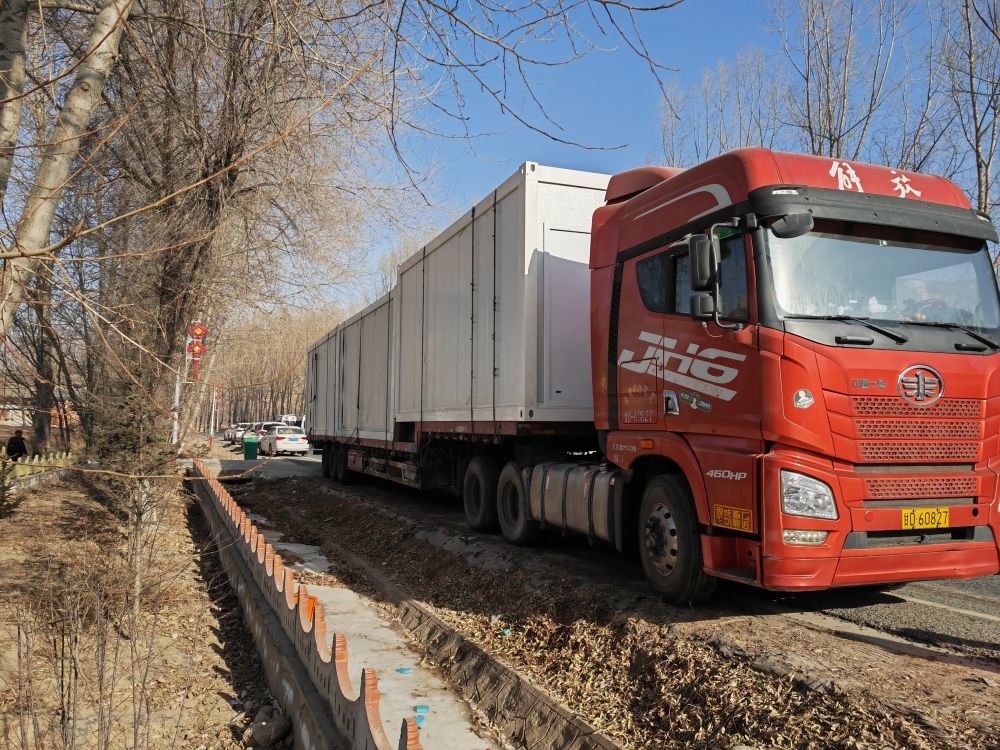 装着集装箱式彩钢板房的物资车运抵积石山县刘集乡陶家村。新华社记者王朋摄