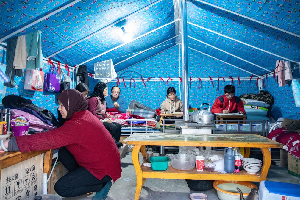 在大河家镇大河村广场集中安置点,马瑞(右一)和家人在帐篷里生活。新华社记者郎兵兵 摄