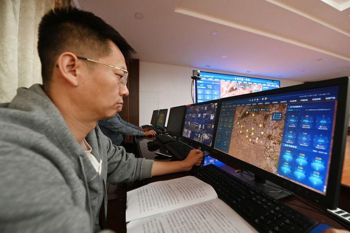 2023年10月12日,在张掖市生态环境局,工作人员通过“生态环境一张图”查阅相关环保数据。新华每日电讯记者范培珅摄