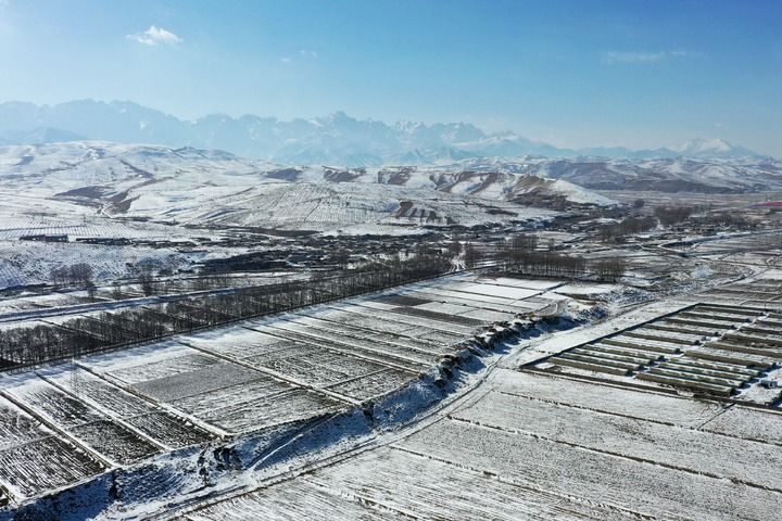 2023年2月14日,位于甘肃省武威市天祝藏族自治县境内的祁连山支脉乌鞘岭被白雪覆盖,宛如水墨画(无人机照片)。新华每日电讯记者范培珅摄