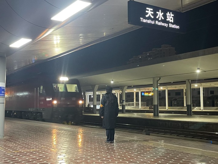 1月29日21时49分,随着电铃响起,Z152次列车缓缓驶入甘肃省天水站。夜幕深沉,寒意倍浓,站台上“00后”女孩王靓怡笔直身姿,迎接着旅客到来。