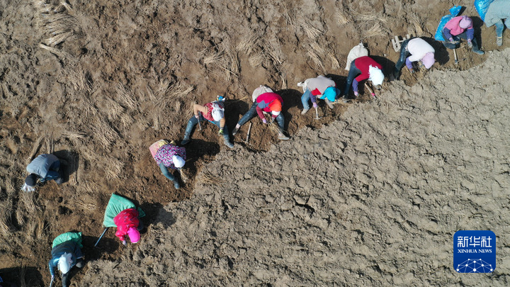 3月7日,在岷县梅川镇中药材标准化种植基地内,药农在采挖黄芪种苗(无人机照片)。新华社记者 陈斌 摄