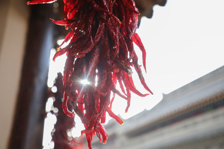 3月20日,在天水市秦州区天水古城一商铺前拍摄的晾晒的干辣椒。新华每日电讯记者 马希平 摄