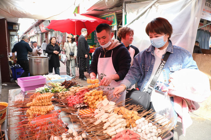 3月19日,游客在天水市秦州区的一麻辣烫摊位前选取菜品。新华每日电讯记者 马希平 摄