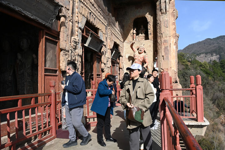 3月20日,游客在位于天水市麦积区的麦积山石窟参观游览。新华每日电讯记者 范培珅 摄