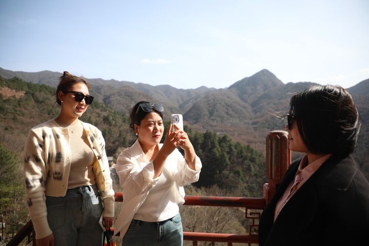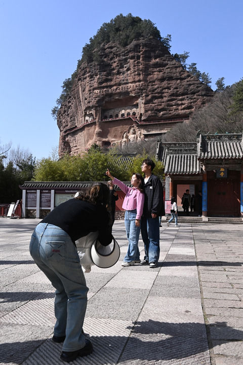 3月20日,游客在位于天水市麦积区的麦积山石窟拍照留念。新华每日电讯记者 马希平 摄