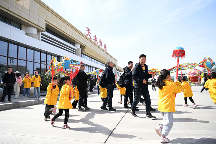 3月19日,天水市一家幼儿园的小朋友在天水南站迎接出站的游客。新华每日电讯记者 范培珅 摄
