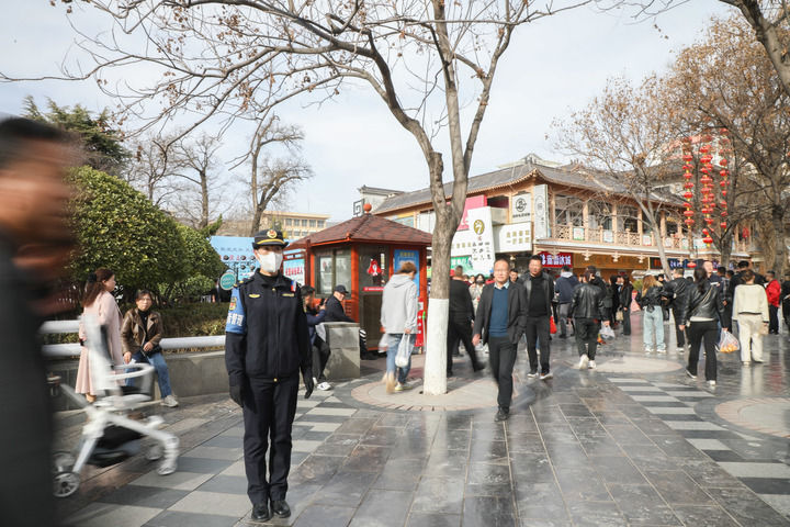 3月19日,天水市秦州区一城市综合执法工作人员在步行街站岗值守。新华每日电讯记者 马希平 摄
