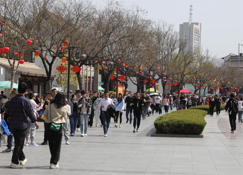 4月4日,游客在甘肃省天水市伏羲城步行街游览参观。新华社记者张智敏摄