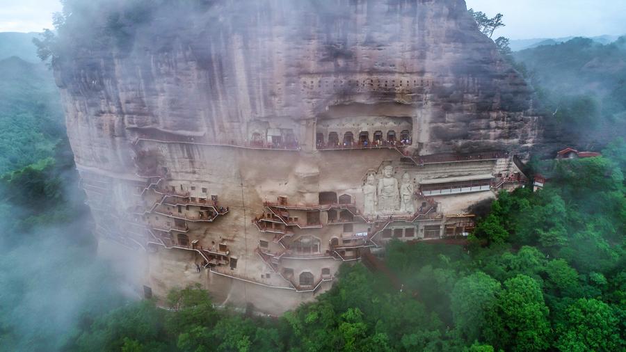 这是2023年5月31日在甘肃省天水市拍摄的烟雨笼罩下的麦积山石窟(无人机照片)。新华社记者 郎兵兵 摄