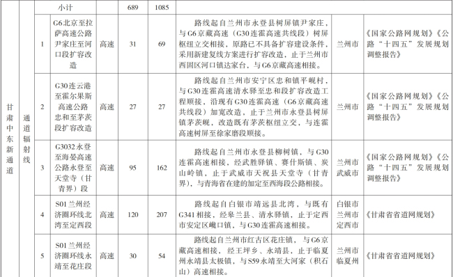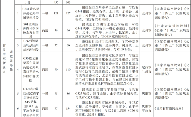 (三)甘肃中东高速公路新通道。该通道起于庆城县驿马镇、与G22青兰高速相接,止于西固区河口镇、与G6京藏高速相接,自东向西贯穿庆阳、固原(宁夏回族自治区)、白银、兰州4市,辐射庆城、镇原、崆峒、泾川、灵台、庄浪、静宁、秦安、会宁、安定、靖远、榆中、城关、七里河、西固、安宁、红古、永登、永靖、天祝20县(区)。该通道由1条主通道、5条通道联络线和14条通道辐射线构成。主通道全长311公里,由新建S40庆城至小园子(甘宁界)、S40祁家南山(甘宁界)至清水驿、S62兴隆山旅游专用公路、S40石佛沟至河口段共同形成主通道。带动建设G341中川至河桥、S01河桥至海石湾、G666景泰至兰州、G30连霍高速景家口至清水驿段扩容改造、G327宁县至镇原、S15镇原至平凉等联络线和G6京藏高速尹家庄至河口段扩容改造、G30连霍高速忠和至茅茨段扩容改造、G3032永登至天堂寺、S01兰州经济圈环线北湾至定西、S01兰州经济圈环线永靖至花庄、S58青白石至忠和、S31隆德至庄浪、S31静宁至秦安、S19彭阳(宁夏)至永寿(陕西)平凉段、S19彭阳(宁夏)至永寿(陕西)庆阳段、S21平凉至千阳(陕西)、S23平凉机场高速、S517泾川至四十里铺、G341二车公路至G85银昆高速等辐射线。