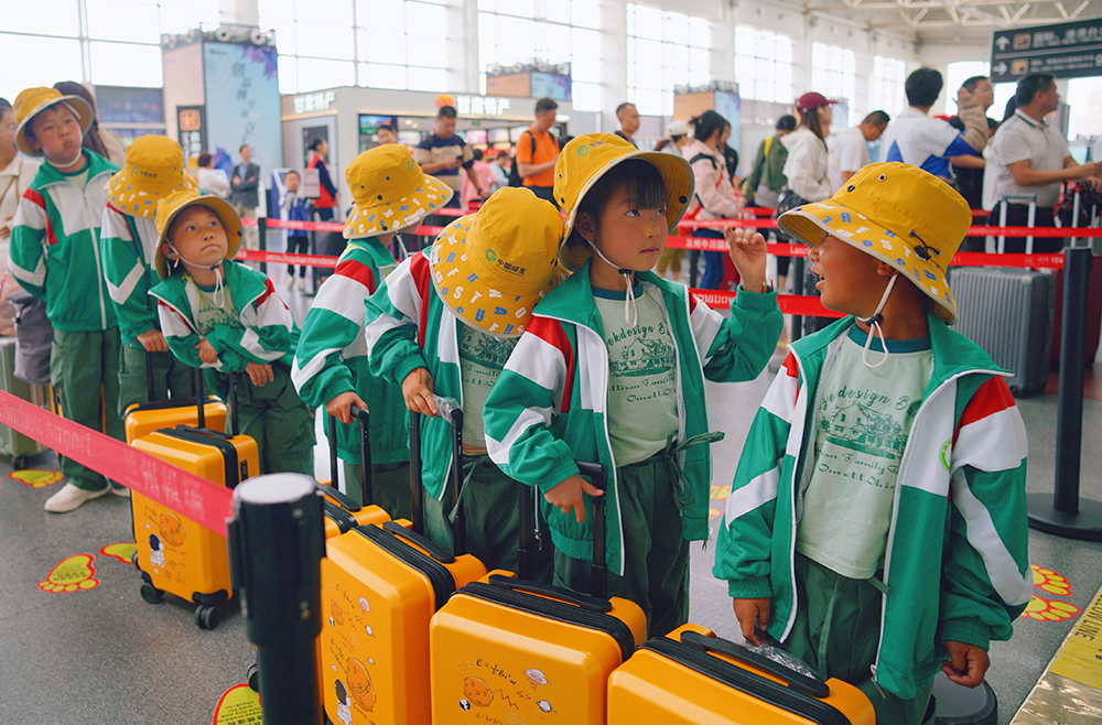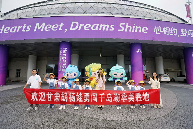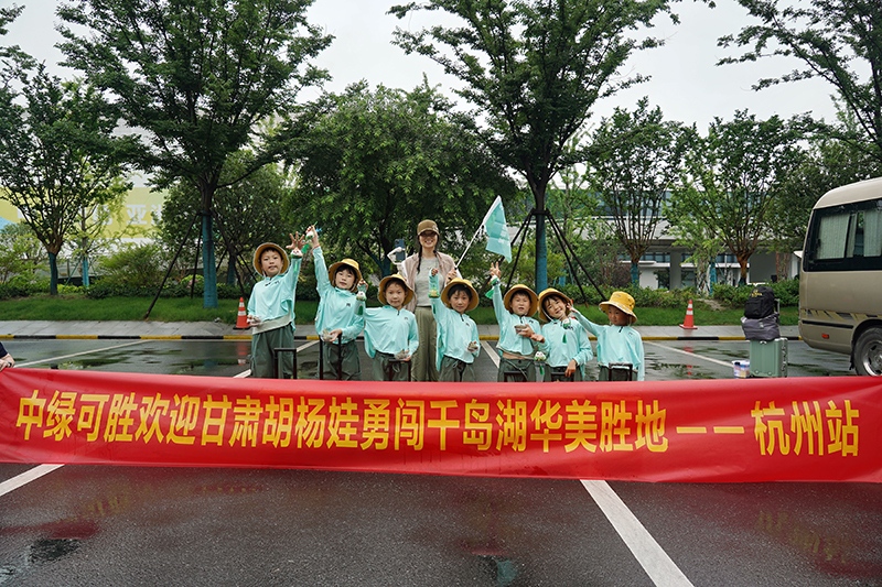 大西北网讯(记者王志俭文图)6月10日,7名来自航天员唐胜杰母校——甘肃省定西花沟学校的学生身着统一绿色工装套服、头戴黄色渔夫帽,每人拖着航天员行李箱,排着整齐队伍向千岛湖进发。