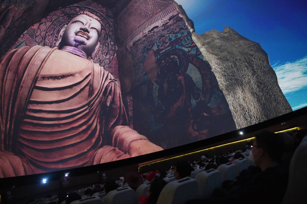 游客在莫高窟数字展示中心观看球幕电影《梦幻佛宫》。记者 陈斌 摄