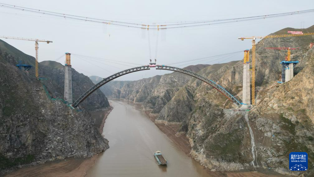 11月2日,中国铁建大桥局工人在兰合铁路洮河大桥上吊装劲性拱架(无人机照片)。新华社发(史有东 摄)