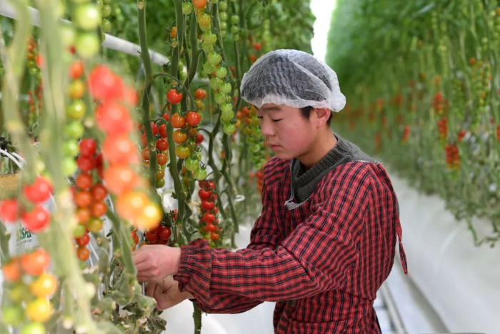 在古浪县黄花滩生态移民区富民新村现代化智能玻璃温室,村民在管护番茄。范培珅 摄