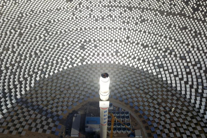 人们惊呼,这是自然力与人类智慧的完美创造:戈壁荒滩上“种”出了人造太阳。这个100兆瓦熔盐塔式光热电站,占地面积相当于780个足球场,每年所生产的绿电可减排35万吨二氧化碳。