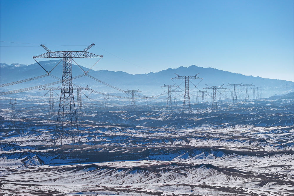这是在甘肃省张掖市境内拍摄的3条并行的特高压外送通道,从右往左依次是±1100千伏吉泉线、±800千伏祁韶线、±800千伏哈郑线。(潘磊摄)