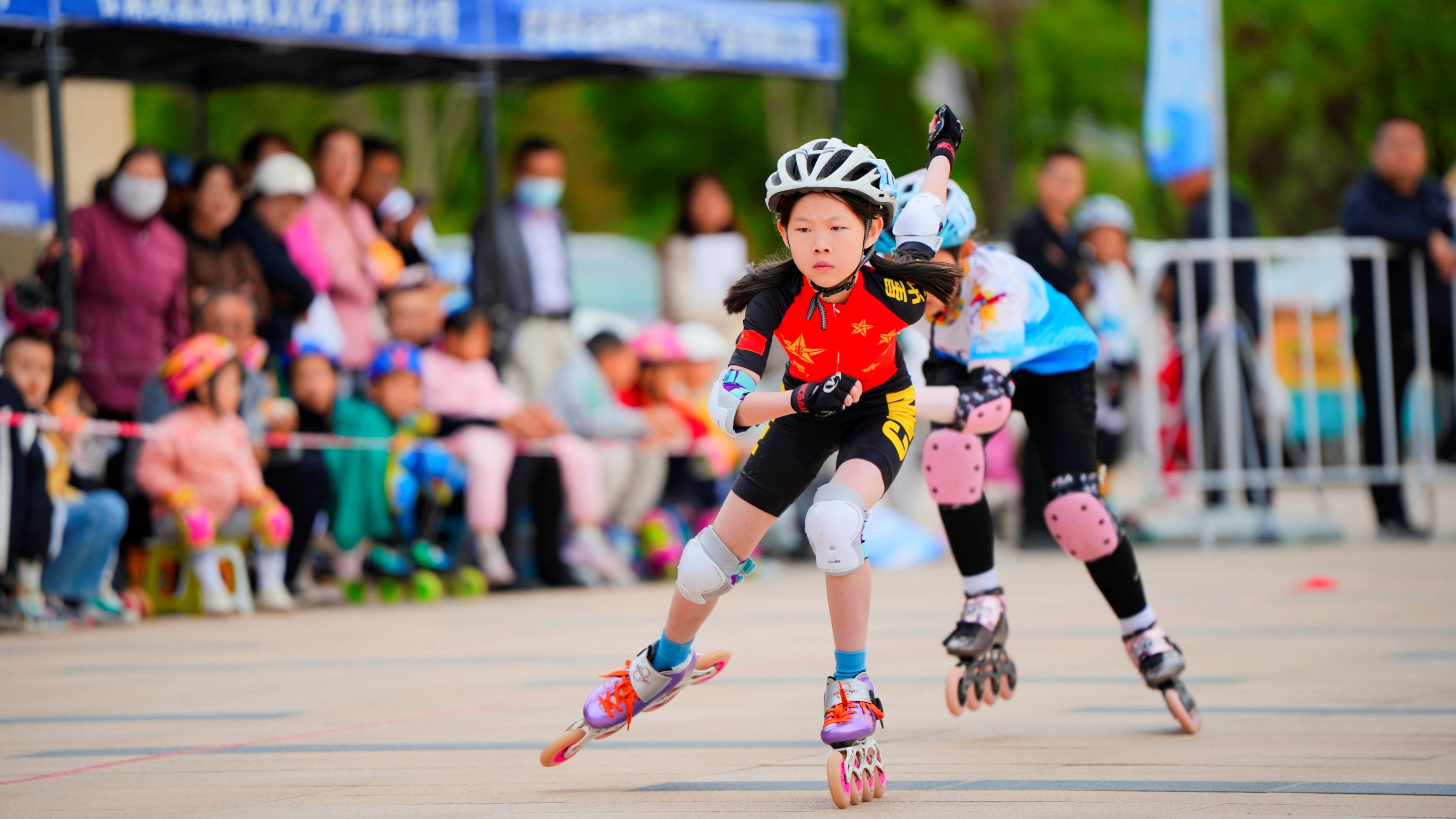 赛场上,轮滑小将们身着专业装备,身姿矫健。发令汽笛声响后,他们如离弦之箭弹射而出,轮滑与地面摩擦发出的“唰唰”声与“风驰电掣”的身影,共同构成速度与力量的视觉盛宴。弯道处,选手们压低重心,以精妙的技巧完成漂移过弯;直道上,他们全力冲刺,迸发出惊人爆发力。观众们的欢呼声、助威声震耳欲聋,更有家长和教练在场边大声指导,热烈氛围点燃全场。