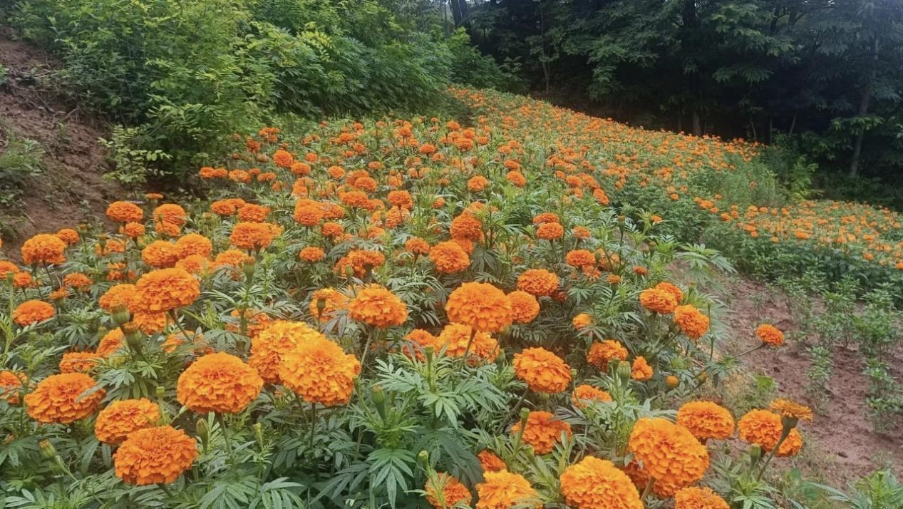 种植户李大哥家有4亩贫瘠的林地,收入微薄。今年加入合作社后,他不仅领到了免费的优质种苗,还全程跟着技术人员学习科学管理,如今自家田里的万寿菊株壮花艳,比往年增产近三成。“合作社就像‘主心骨’,有党支部盯着,技术有人教,销路不用愁,咱只管专心种好花!”李大哥的话道出了不少农户的心声。
