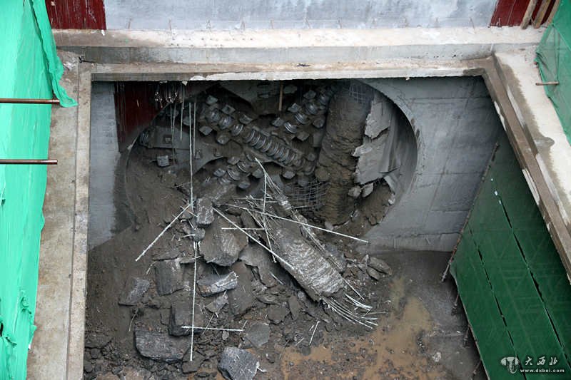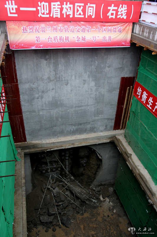 当日上午11时,随着现场“出井仪式开始”话音的落下,迎门滩站基坑内的接收井连续墙开始有细沙缓缓的流下,随着蓝色、红色两面旗帜的不断挥舞,屏声静气的人们目不转睛望着不时松动的墙体,争相目睹这一历史性时刻。“出来了,出来了”。经过焦急等待,“金城一号”盾构机在人们的欢呼声中终于露出直径达6.44米的“龙头”,轰鸣着扫向面前两个巨大的桩基。掘进、破壁、出井,在如注的大雨中,锃亮的盾构机刀片在经过缓慢旋转首次呈现在金城市民眼前,至此,自4月1日下井,6月5日开始“潜伏”地下作业的钻地龙,经过近6个月的时间顺利出井,标志着兰州城轨道交通1号线一期工程试验段世纪大道车站主体工程主体工程完工暨“金城一号”盾构机出井,给即将到来的中秋佳节再添喜庆。试验段项目部工程技术部部长宋卫杰表示,下一步将对盾构机进行起吊,转场至安宁世纪大道站,开始左线区间掘进,预计2014年1月底贯通。