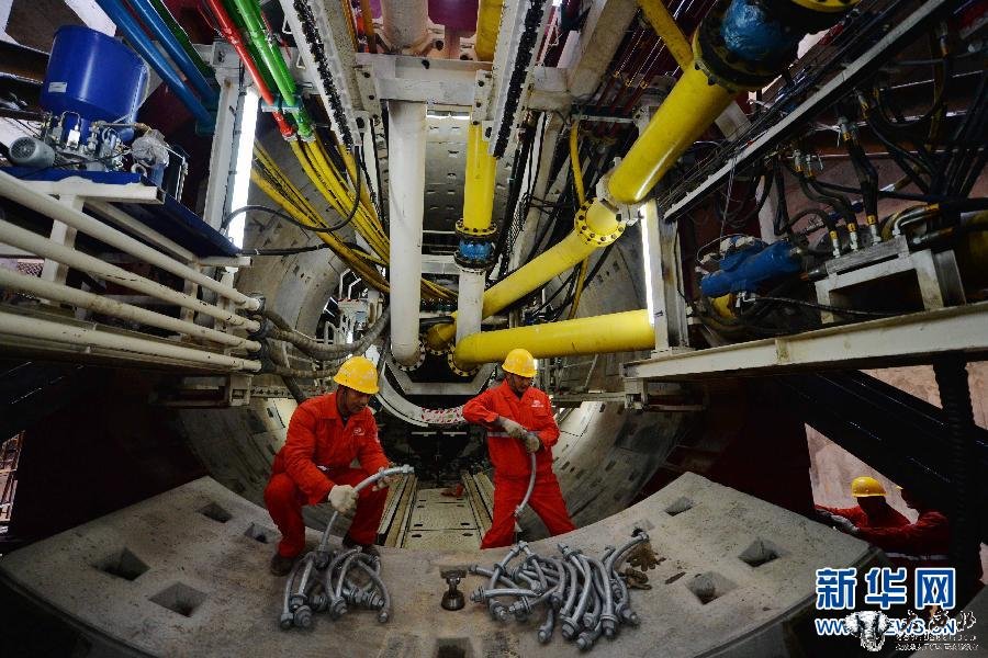 11月2日,两名施工人员在地铁盾构机内作业。当日,国内首条下穿黄河的地铁隧道工程—兰州轨道交通1号线迎门滩至马滩地铁隧道正式开始地下掘进作业。