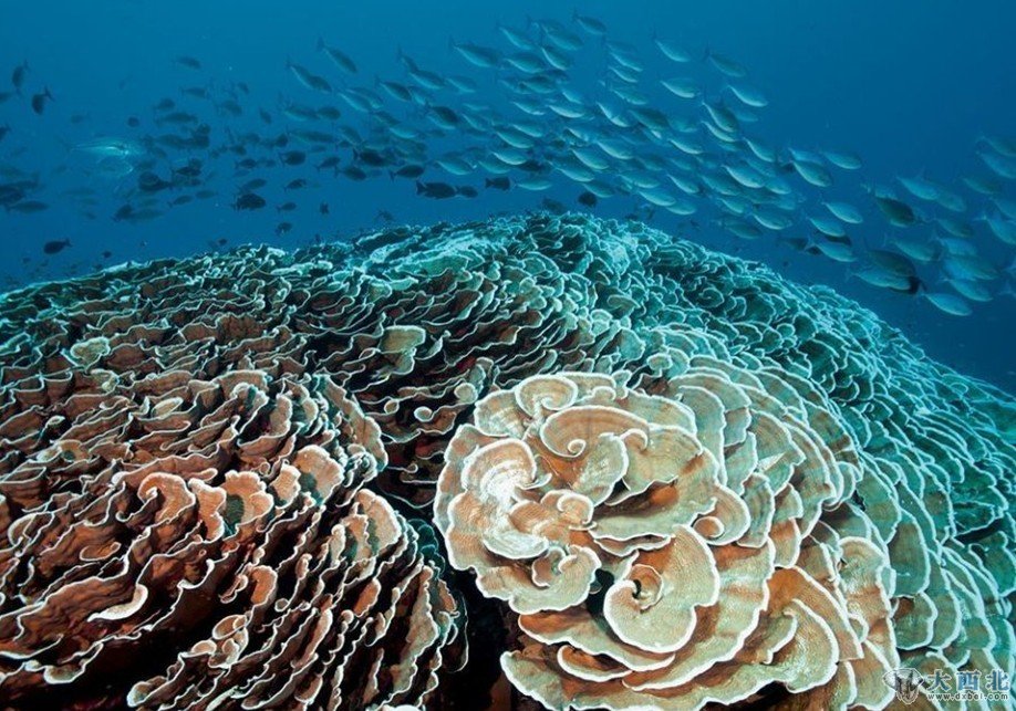 印度尼西亚四皇群岛一座海底山斜坡上的巨大甘蓝珊瑚。这个巨大的珊蝴为螃蟹、虾以及其他动物提供了一个栖息之所。过往鱼群以这些无脊椎动物或者强洋流带来的浮游生物为食。