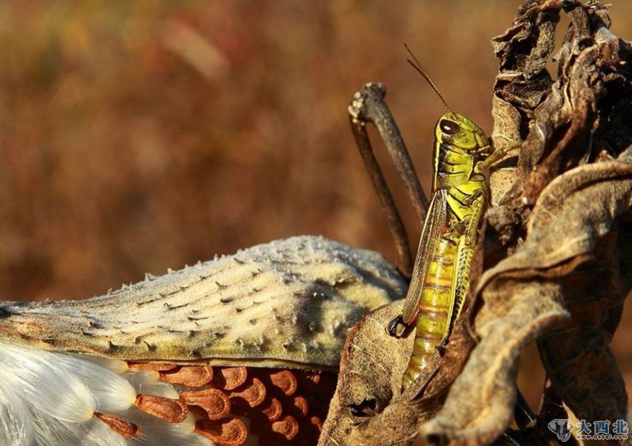 初秋的一个下午,美国威斯康星州的北方冰穴碛州立森林公园,一只大蝗虫趴在马利筋豆荚上。