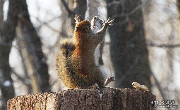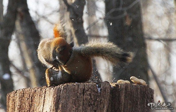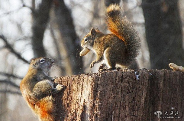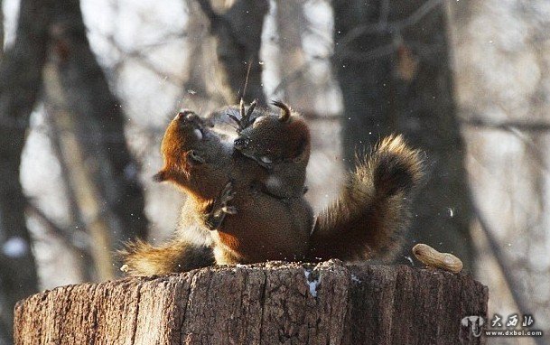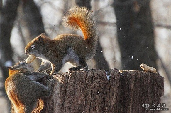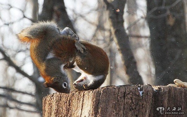 树桩之上,一只松鼠正准备开始大快朵颐,而另一只松鼠爬了上来,使劲盯着它嘴里的花生。47岁的摄影师安德烈·莫洛佐夫近日在加拿大安大略省的皇家植物园中,拍下了两只松鼠角斗的画面。这两只红松鼠外表看起来十分可爱,但打斗起来却异常凶猛。
