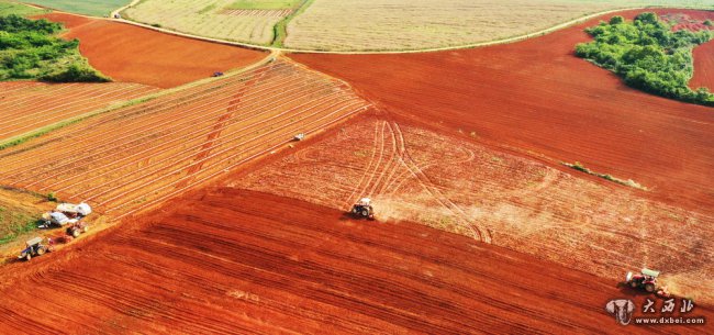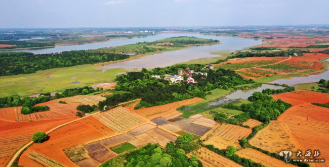 暮春时节,樟树市义成镇2.8万亩红土地里种上了成片的花生、西瓜、枳壳、栀子花等经济作物,田间地头一派繁忙景象。放眼望去,红色的土地、斑斓的稻田、湛蓝的湖水、蜿蜒的道路和绿油油的药材苗木,衬以蓝天、白云,构成了一幅壮美的乡村新画卷。周亮摄(人民图片网)