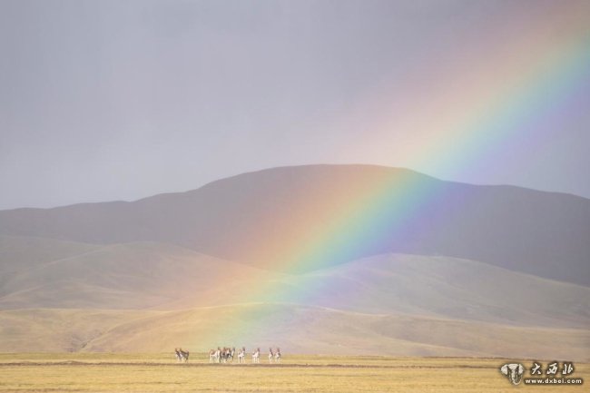 这是9月22日在羌塘国家级自然保护区拍摄的彩虹之下的藏野驴。