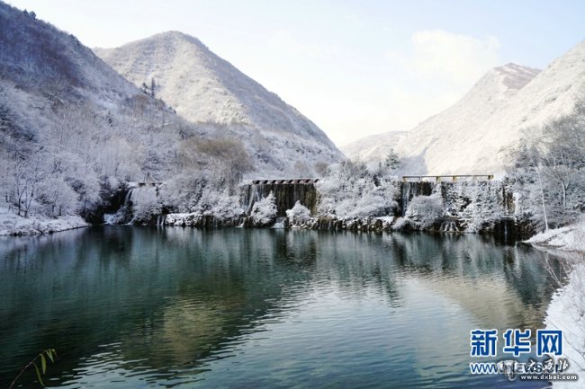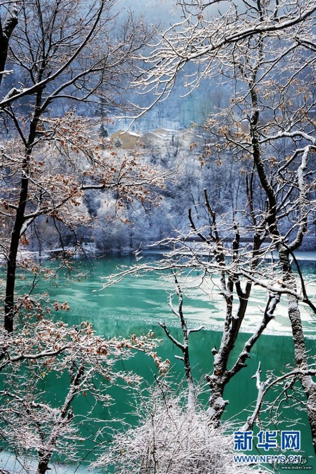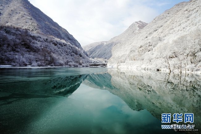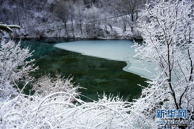 近日,位于甘肃省陇南市宕昌县的官鹅沟国家森林公园迎来降雪。大山被白雪覆盖,一片银装素裹,与碧绿的湖水、婆娑的雾凇勾勒出一幅冬日画卷。新华网发(刘辉 摄)