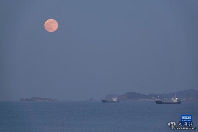12月19日在山东省烟台市蓬莱区海滨拍摄的满月。
