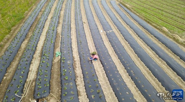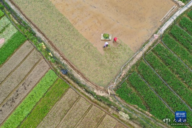 3月9日,广西南宁市西乡塘区石埠街道下灵村村民在种植蔬菜(无人机照片)。