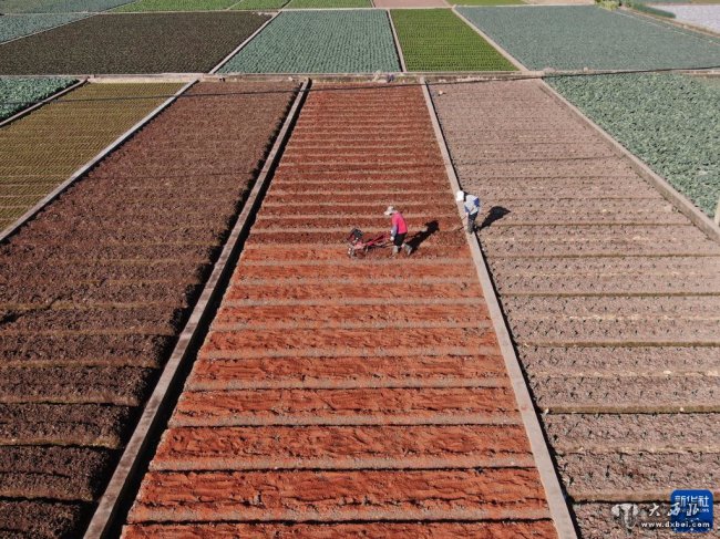 3月10日,云南通海县九龙街道大河嘴社区的农民在翻耕农田准备接茬种植蔬菜(无人机照片)。