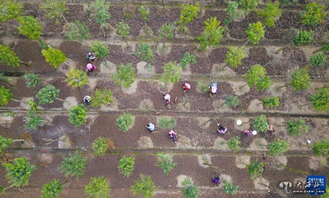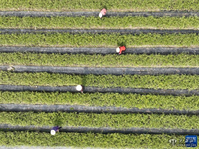 3月10日,湖北省宜昌市秭归县柑橘良种繁育基地的工人在进行苗床管理作业(无人机照片)。