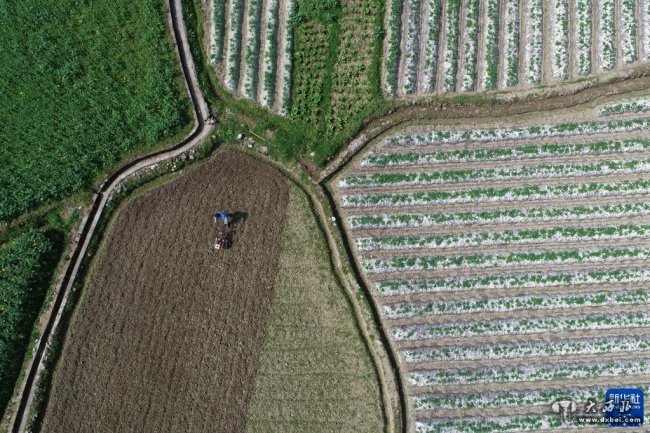 3月10日,村民在贵州省毕节市七星关区朱昌镇双堰社区的田间劳作(无人机照片)。