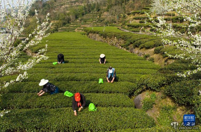 3月15日,湖北省宜昌市秭归县茅坪镇中坝子村村民在茶园采茶(无人机照片)。 新华社发(郑家裕摄)