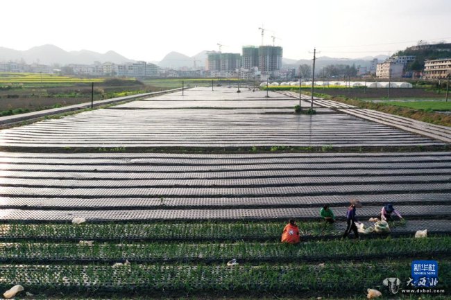 3月15日,在贵州省黔南布依族苗族自治州福泉市龙昌镇,村民在田间栽种香葱(无人机照片)。新华社发(易盛武摄)