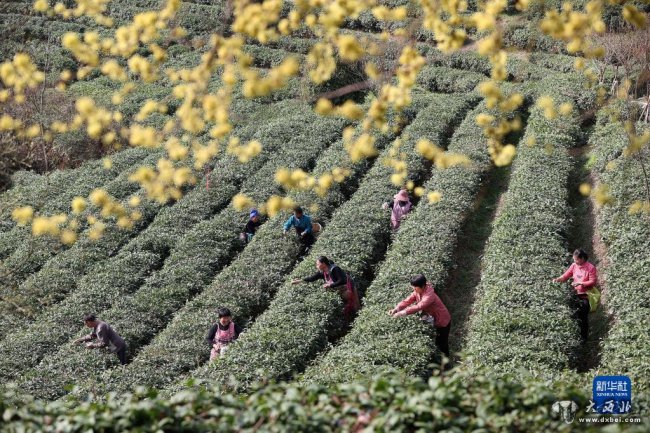 3月15日,村民在贵州省黔东南苗族侗族自治州丹寨县龙泉镇马寨茶园采摘春茶。新华社发(黄晓海摄)
