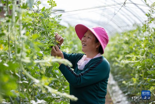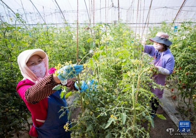 3月20日,在宁夏银川市贺兰县习岗镇新平设施农业园区瑞信果蔬农庄温棚内,农民为小番茄打叉。 新华社记者 杨植森 摄