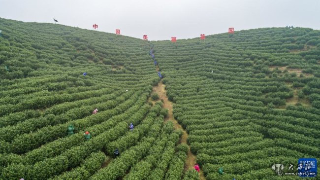3月20日,在浙江省余姚市兰江街道一茶场,茶农在采摘茶叶(无人机照片)。